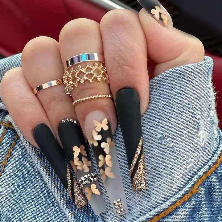 Set unghii false autoadezive tip press-on 24 de bucati fluturi gold si strasuri stralucitoare, Toxic Beauty, Butterfly